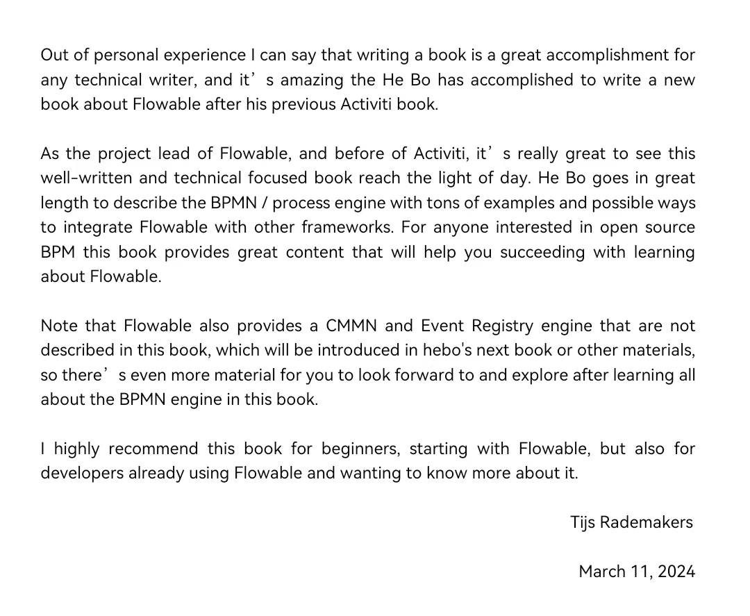 强烈推荐贺波老师的《深入Flowable流程引擎:核心原理与高阶实战》,Flowable 创始人 Tijs Rademakers 亲笔作序,该书对系统学习和深入掌握 Flowable 极有帮助,书中涵盖很多大型流程中心平台所涉及的技术架构和场景案例。橙单团队作为贺老师的忠实粉丝,我们希望这本书可以帮助到更多对工作流有兴趣的开发者们。推荐购买链接