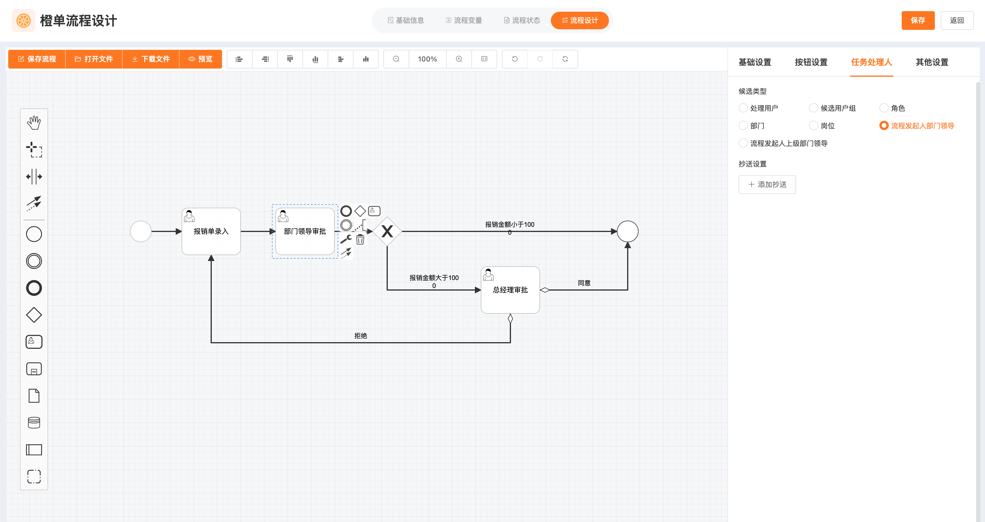 - 用户选择,支持基于角色、部门、岗位、本部门岗位、上级部门岗位、同级部门岗位、指定部门岗位、本部门领导岗位、上级部门领导岗位等候选组。