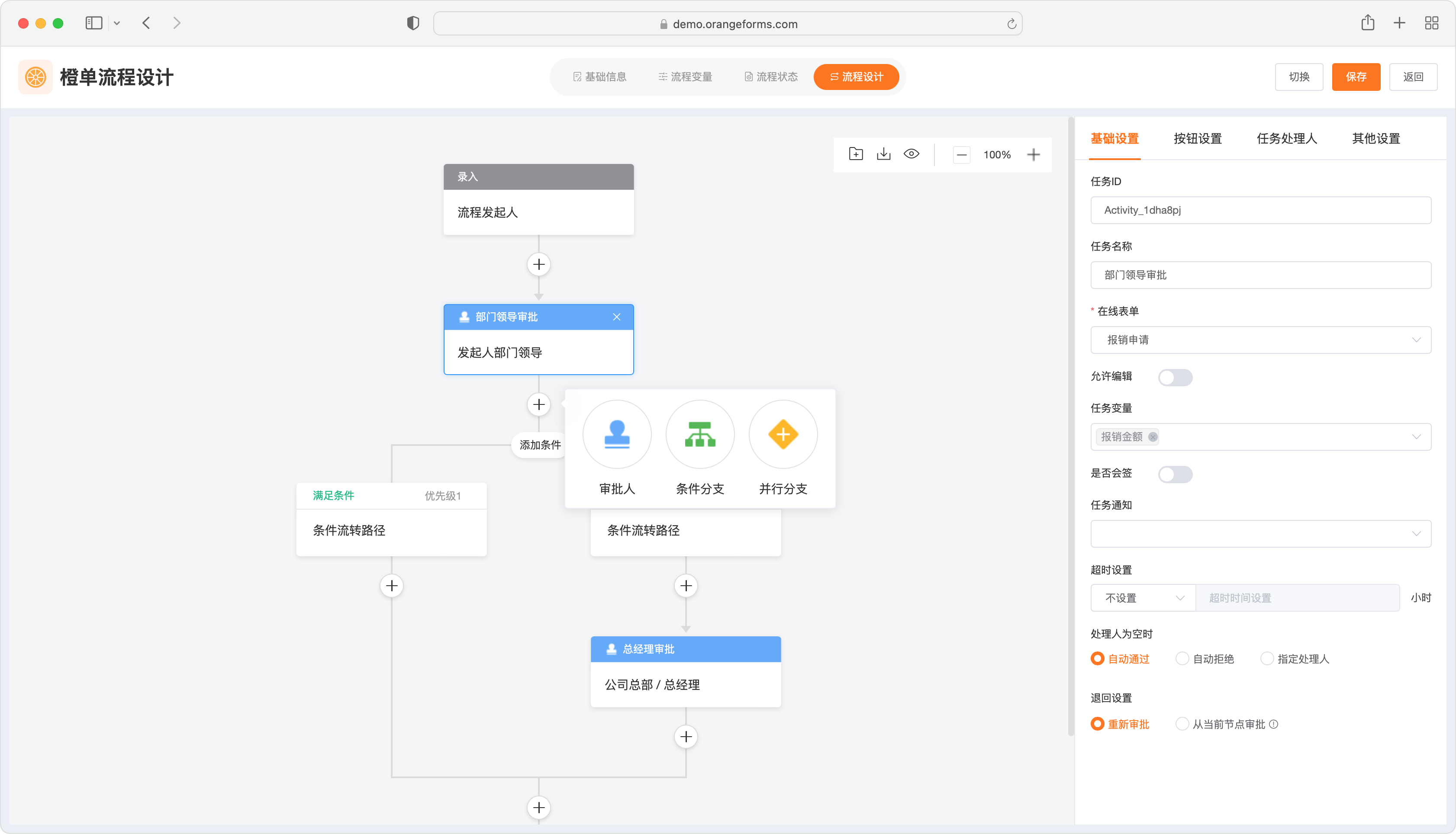 - 前端提供高颜值的表单编辑器和流程编辑器,完整可用的流程功能,以及精致统一的前端样式规范。
