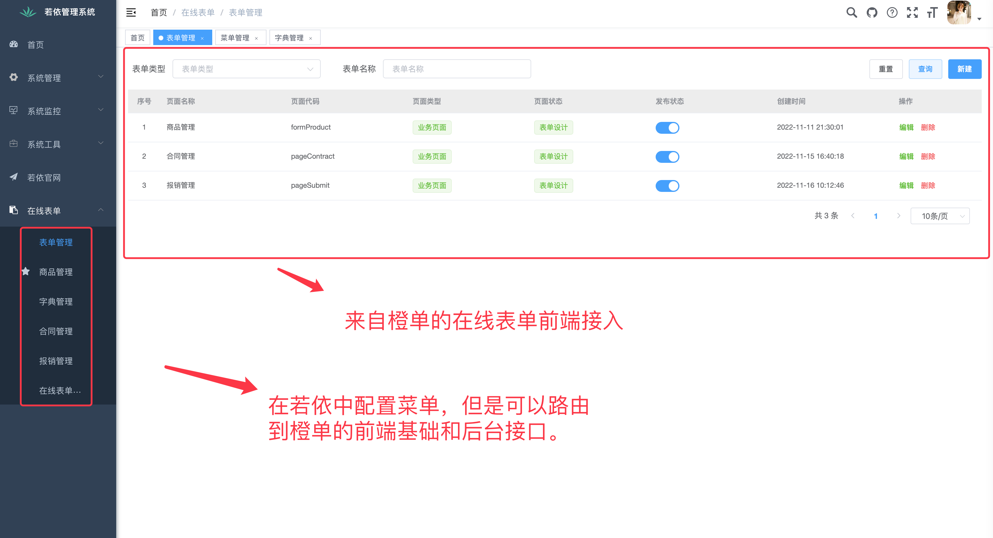 - 在线表单,不修改任何 若依 默认代码的前提下,仅通过新增插件接口的方式,为 若依 集成橙单的在线表单功能。